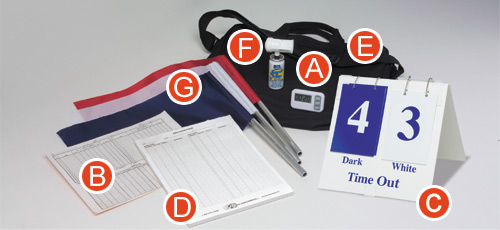 Everything you need for game management. Set includes 2 ea. Excel Countdown timers, 1 ea Time Out Board 1 ea Desk Flag set, 1 ea Exclusion